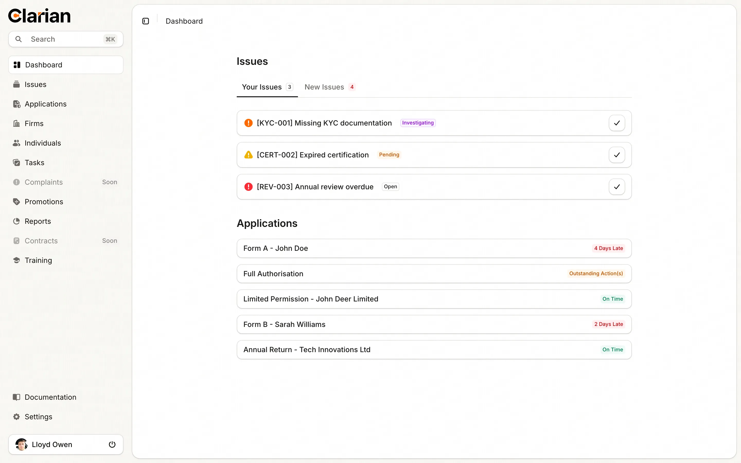 Clarian was built to replace that. A single platform where firms can manage their entire compliance network, track staff certifications, and let AI continuously monitor for the kind of subtle risks — gaps in address history, expired certifications, non-compliant promotions — that the FCA will find if you don't.